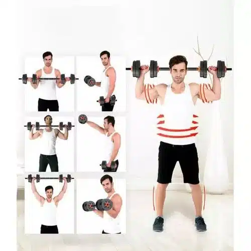 Ce kit haltères 20 kg (مجموعة دمبل 20 كيلو) comprend plusieurs disques de poids, une barre solide et des colliers de serrage sécurisés. Il permet de réaliser une grande variété d’exercices pour renforcer les bras, les épaules, la poitrine, le dos et les jambes (تمارين كمال الأجسام في المنزل).